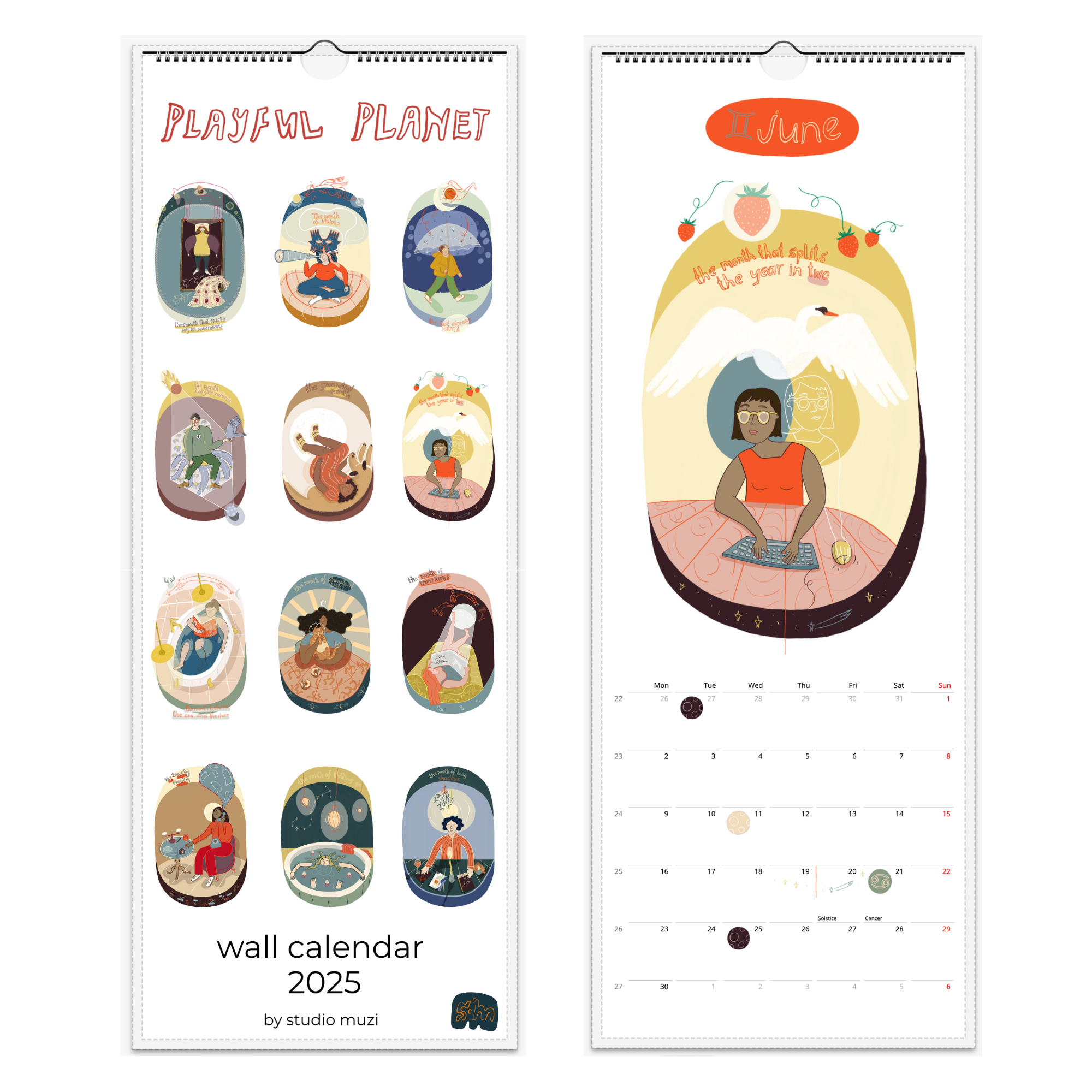 this wall calendar is filled with monthly illustrations based on folklore, astronomy, global holidays and natural events of the year. It also includes full & new moon, zodiac seasons, as well as solstices and equinoxes. Please note the calendar automatically adds official holidays of the country of order.